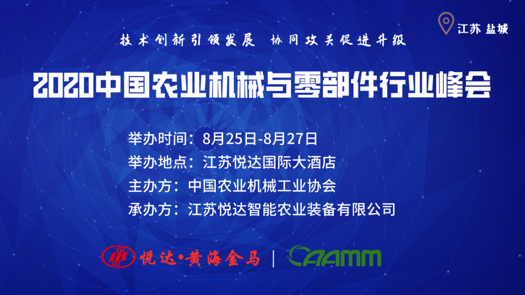 8月25日-27日,由中国农业机械工业协会主办,江苏悦达智能农业装备有限公司承办的“2020中国农业机械与零部件行业峰会”将在江苏省盐城市悦达国际大酒店举办。本届峰会以“技术创新引领发展 协同攻关促进升级”为主题,围绕科技创新、产品升级、提质增效的主线,推动农机工业步入高质量发展阶段。