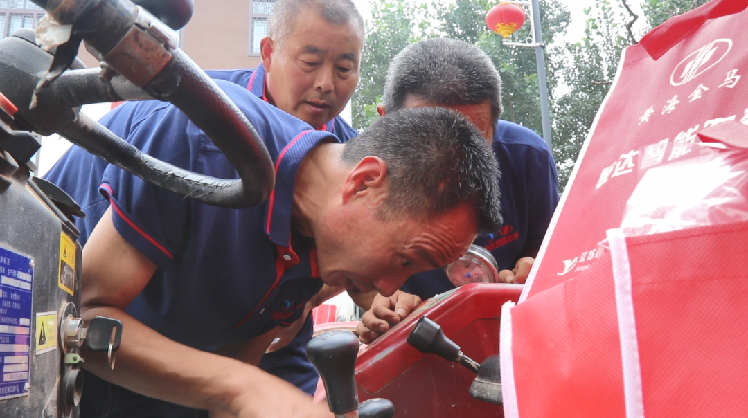 图为公司山东片区经理李敬为用户保养拖拉机