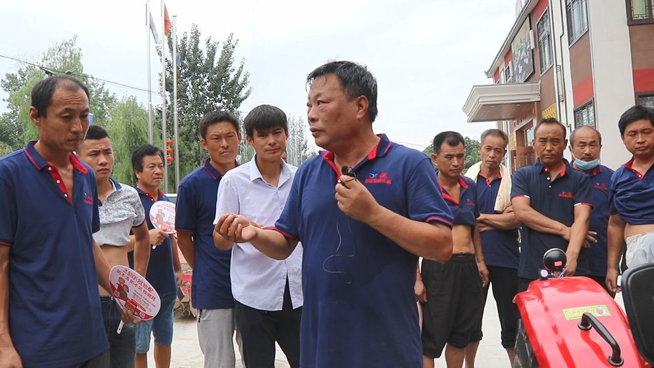 图为公司服务部部长史伟波现场讲解大棚王拖拉机
