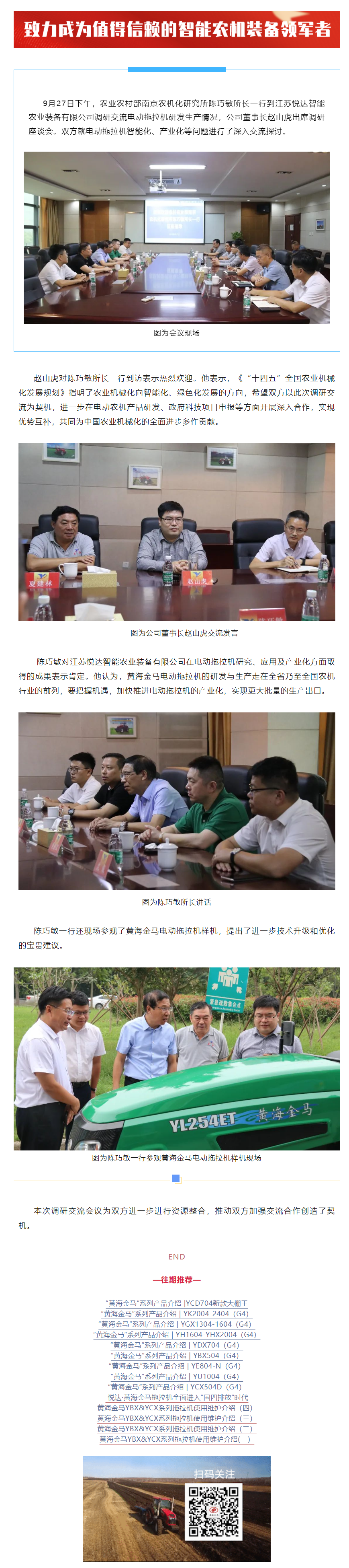 农业农村部南京农机化研究所陈巧敏所长一行到江苏悦达智能农业装备有限公司调研交流电动拖拉机研发生产情况